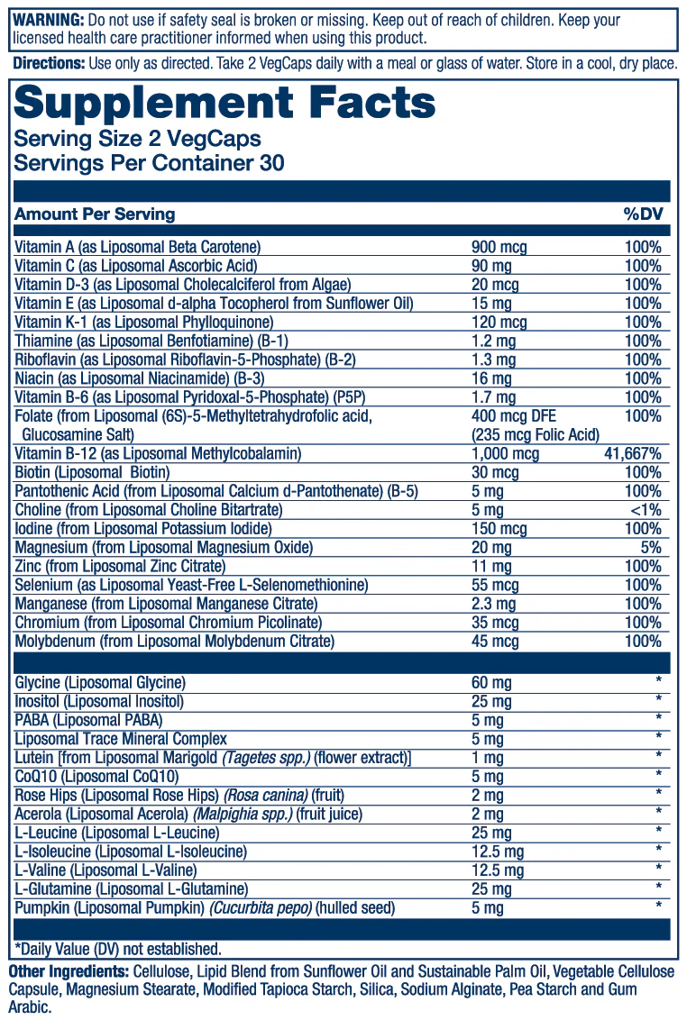 Liposomal Multi Men’s delivers a first-of-its-kind, patent-pending formula that packs 34 liposomal nutrients into just 2 easy-to-digest capsules per day. With 18 vitamins and minerals at 100% of the Daily Value or more, this high-potency blend includes zinc to support the immune system, heart, and muscles, along with thiamine for cellular energy, and antioxidant vitamins C and E. It also features methylated B vitamins for rapid absorption, plus BCAAs, L-glutamine, and pumpkin seed for additional performance and recovery support. Designed for convenience, this gentle formula can be taken with or without food, redefining how men get their daily nutrients.