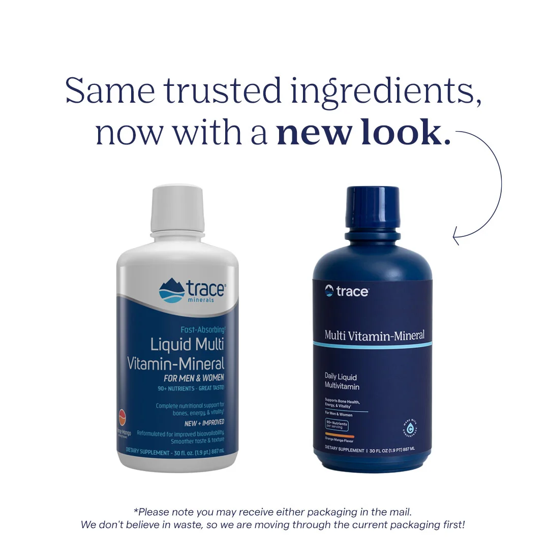 Our new and improved Liquid Multi Vitamin-Mineral formula features a better flavor, smoother texture, and enhanced bioavailability, delivering superior nourishment with every serving. Packed with essential nutrients like calcium, magnesium, vitamin K2, B-complex vitamins, and antioxidants, it supports bone health, energy metabolism, and overall vitality. Supercharged with ConcenTrace®, a naturally occurring full spectrum ionic trace mineral complex, this formula promotes optimal body-mineral balance and provides a comprehensive daily boost for your bones, muscles, and energy levels.