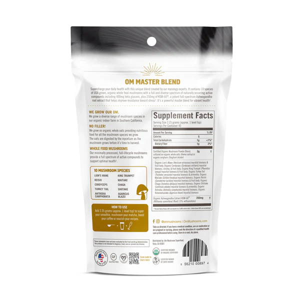 Supercharge your daily health with Mushroom Master Blend, a unique formula crafted by our expert mycologists. This blend features 10 species of USA-grown, organic whole food mushrooms, delivering a full spectrum of naturally occurring active compounds, including 400mg beta glucans. It also contains 250mg KSM-66®, a potent Ashwagandha root extract, known for its ability to improve resistance to stress. This powerful blend is designed to promote vibrant health, immune support, and overall vitality.